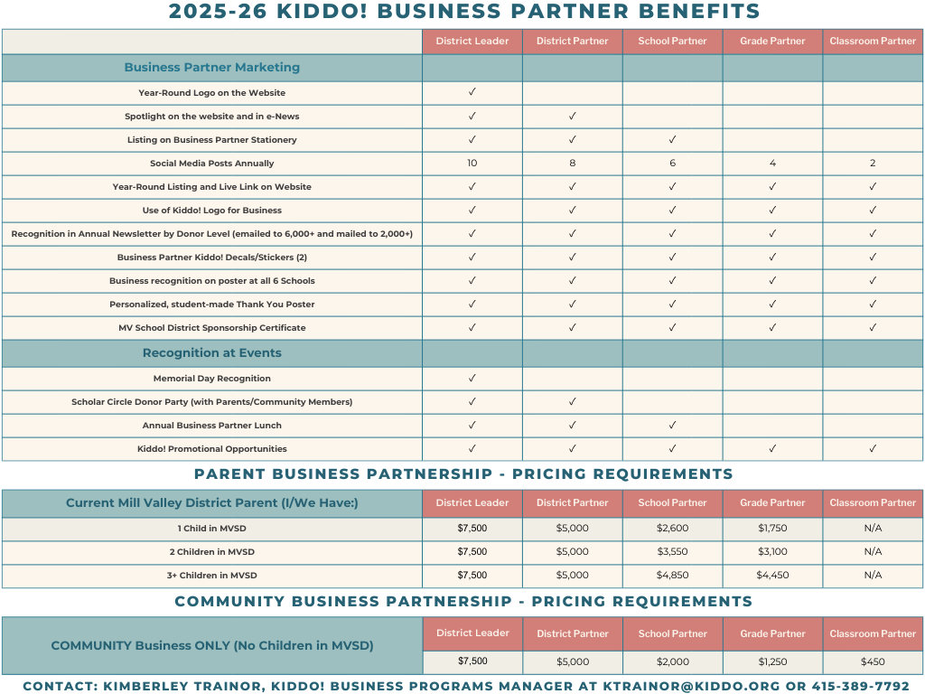 Be sure to review our benefit guide to see the exclusive perks on offer. By becoming a Kiddo! Parent Business Partner, you show your school community how much you care, which allows us to highlight and support your business, garnering appreciation and patronage from grateful families.